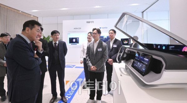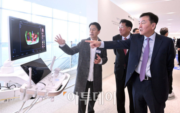 ▲신제윤 삼성전자 이사회 의장과 사외이사들이 19일 경기 수원시 영통구 수원컨벤션센터에서 열린 삼성전자 제56기 정기 주주총회에서 관계자에게 의료기기에 대한 설명을 듣고 있다. 삼성전자는 이날 주주총회에서 주주체험 강화를 위해 삼성전자 AI Home, 볼리(Ballie), 차세대 디스플레이, 갤럭시 AI, 의료기기, 하만 전장과 오디오 등을 전시했다. 조현호 기자 hyunho@