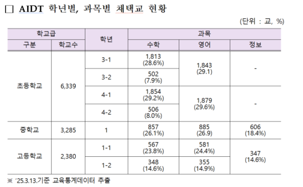 중학교 1학년은 총 3285개 학교 중 수학 857곳(26.1%), 영어 885곳(26.9%)이 AI교과서를 채택했다.
