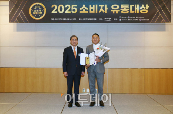26일 서울 여의도 FKI타워 컨퍼런스센터에서 열린 ‘2025 소비자 유통대상’에서 지속가능부문 최우수상을 수상한 감동훈 롯데칠성음료 상무와 시상자인 김덕헌 이투데이 대표이사가 기념촬영을 하고 있다. 이투데이 주최로 올해 15회째를 맞이한 소비자 유통대상은 고물가로 소비 심리가 위축된 상황에서도 다양한 혁신을 통해 한국 유통산업의 발전을 꾀하고, 소비자의 삶의 질을 높이기 위해 힘쓴 기업들을 발굴·시상하는 자리다.