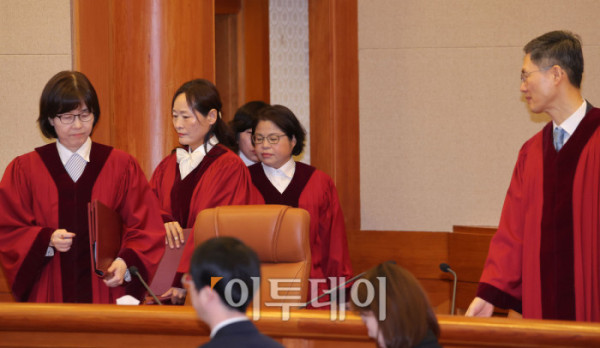 ▲정계선, 김복형 헌법재판관들이 27일 서울 종로구 헌법재판소 대심판정에서 열린 3월 헌법소원 심판 등 일반 사건 선고에 입장하고 있다. 조현호 기자 hyunho@