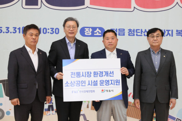 ▲김창범 한경협 부회장이 31일 전북 정읍시 첨단산업단지 복합문화센터에서 열린 경영자문 상담회 '찾아가는 소망버스-전북편'에서 이칠범 정읍시 소상공인위원회 위원장에게 전통시장 및 소상공인 시설 운영지원금을 전달하고 있다. 왼쪽부터 이학수 정읍시장, 김창범 한경협 부회장, 이칠범 정읍시소상공인연합회 회장, 박일 정읍시의회 의장 (사진=한경협)