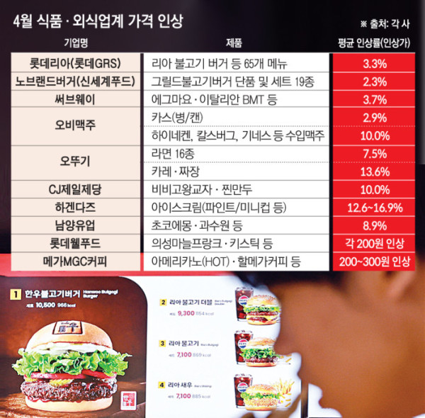 식품외식업계의 가격 인상 행렬이 4월부터 본격화 됐다. 가벼운 한 끼의 대명사인 버거 브랜드마저 판매가격 조정에 가세했다. 업계는 원재료 상승 부담과 가맹점 수익 악화 등을 이유로 가격 인상 명분을 내세우고 있지만, 일각에선 국정 혼란을 틈타 무차별적 인상에 나섰다는 비판론도 거세다.