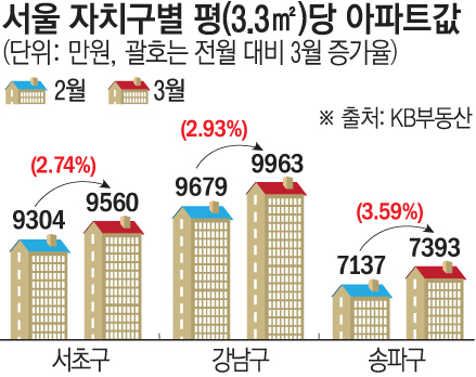 강남구와 함께 서초구와 송파구도 평당 아파트값이 치솟았다. 3월 서초구 아파트 평당 가격은 9304만 원에서 9560만 원으로 2.74% 상승했다. 강남구보다는 평당 400만 원가량 저렴하지만, 9000만 원 중반에 평균 아파트값을 형성하면서 강남구와 함께 평당 평균 1억 원 수준으로 올랐다. 송파구 역시 같은 기간 평당 7137만 원에서 7393만 원으로 올랐다. 3월 기준 전월 대비 상승률만 놓고 보면 1달 만에 3.59% 올라 강남 3구(서초·강남·송파구) 가운데 토허제 해제 영향으로 집값이 가장 많이 오른 곳으로 조사됐다.