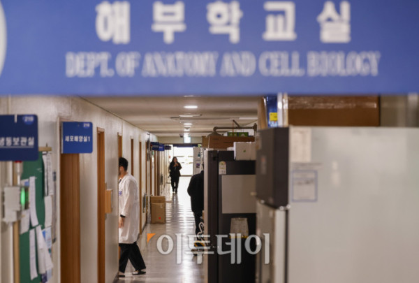 ▲정부가 정한 의대생 복귀 시한일인 31일 서울 종로구 서울대학교 의과대학 해부학교실 복도에서 학생들이 발걸음을 옮기고 있다. 빅5 의대(서울대·연세대·성균관대·카톨릭대·울산대)를 포함해 고려대와 국가거점국립대인 충남대·부산대 의대 휴학생들이 전원 돌아오면서 1년 넘게 이어진 집단휴학 사태도 마무리 국면에 들어서는 모양새다. 이날 각 대학에 따르면 가천대·건국대·계명대·단국대·대구가톨릭대·아주대·원광대·한양대가 등록·복학 신청을 마감한다. 이로써 4월 초·중순까지 신청 기한을 연장한 강원대와 전북대를 제외한 38개 의대가 이날까지 의대생 등록·복학 신청을 종료하게 됐다. 조현호 기자 hyunho@