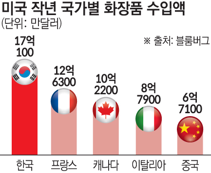 미국 국제무역위원회(USITC)에 따르면 한국의 지난해 대미 화장품 수출액은 17억100만 달러(약 2조5000억 원)로 1위를 차지했다. 이어 프랑스(12억6300만 달러), 캐나다(10억2200만 달러), 이탈리아(8억7900만 달러), 중국(6억7100만 달러) 순으로 집계됐다.
