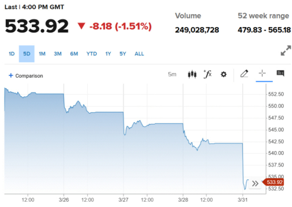 ▲스톡스유럽600지수 추이. 지난달 31일(현지시간) 종가 533.92. 출처 CNBC