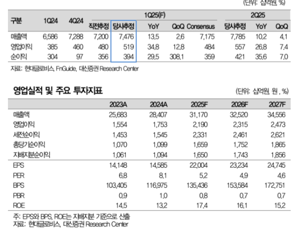 대신증권은 현대글로비스의 1분기 매출액을 7조 4760억 원(전년비 +13.5%), 영업이익 5186억 원(전년비 +34.8%)으로 전망했다. 이는 시장 컨센서스 영업이익 4840억 원을 8% 상회하는 수치다.