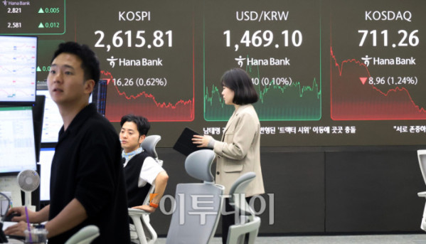 ▲25일 서울 중구 하나은행 딜링룸 전광판에 코스피 지수가 전 거래일보다 16.26포인트(0.62%) 내린 2615.81을 나타내고 있다. 코스닥 지수는 전 거래일보다 8.96포인트(1.24%) 하락한 711.26에 거래를 마쳤다. 원·달러 환율은 주간 거래 종가(15시30분) 기준 전일 대비 1.5원 오른 1469.2원을 기록했다. 고이란 기자 photoeran@ (이투데이DB)