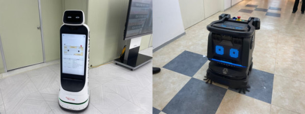 ▲강남구청 1층에 배치된 안내 로봇(왼쪽)과 청소 로봇.
