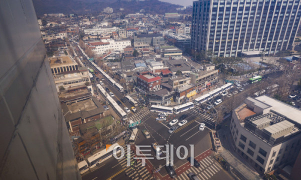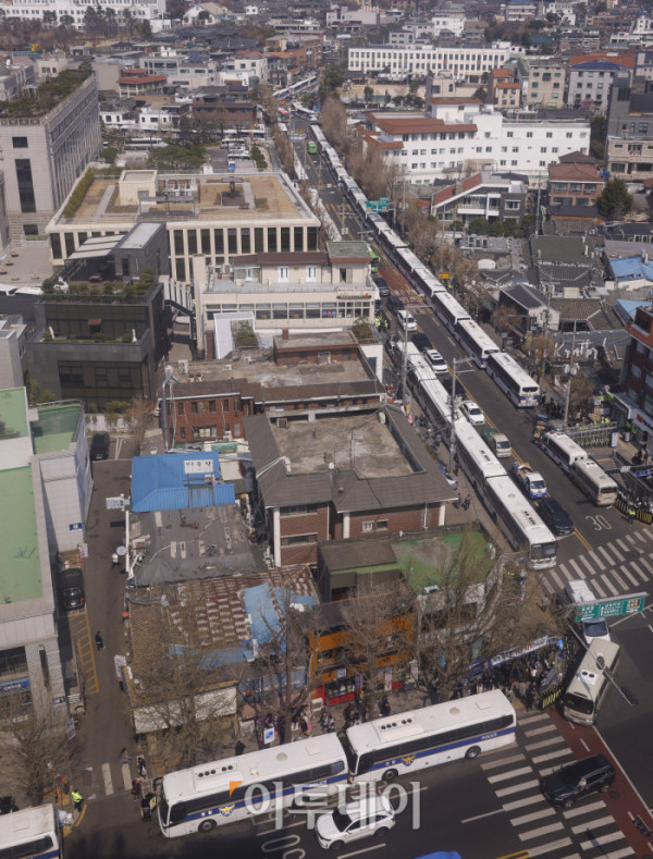 ▲헌법재판소가 윤석열 대통령 탄핵심판 선고일을 발표한 1일 서울 종로구 헌법재판소 앞에 경찰 차벽이 세워져 있다. 헌재는 이날 기자단에 윤 대통령 탄핵 사건에 대한 선고일은 4월 4일 오전 11시 대심판정에서 있을 예정이라고 발표했다. 윤 대통령이 탄핵소추된 지 111일, 변론 종결 이후 38일 만이다. 조현호 기자 hyunho@