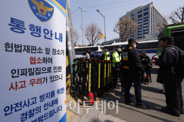 ▲헌법재판소가 윤석열 대통령 탄핵심판 선고일을 발표한 1일 서울 종로구 헌법재판소 앞에서 경찰이 보행자 통행을 통제하고 있다. 헌재는 이날 기자단에 윤 대통령 탄핵 사건에 대한 선고일은 4월 4일 오전 11시 대심판정에서 있을 예정이라고 발표했다. 윤 대통령이 탄핵소추된 지 111일, 변론 종결 이후 38일 만이다. 조현호 기자 hyunho@