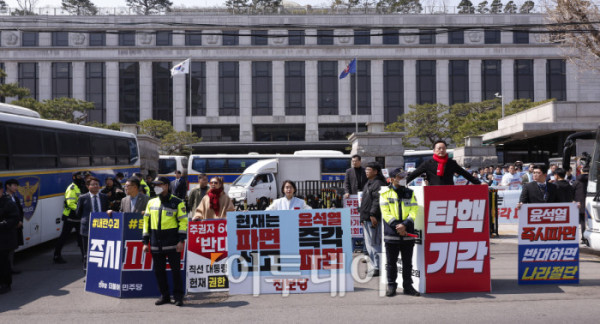 ▲헌법재판소가 윤석열 대통령 탄핵심판 선고일을 발표한 1일 서울 종로구 헌법재판소 앞에서 윤 대통령에 대한 파면, 탄핵 각하를 촉구하는 1인 피켓 시위가 열리고 있다. 헌재는 이날 기자단에 윤 대통령 탄핵 사건에 대한 선고일은 4월 4일 오전 11시 대심판정에서 있을 예정이라고 발표했다. 윤 대통령이 탄핵소추된 지 111일, 변론 종결 이후 38일 만이다. 조현호 기자 hyunho@