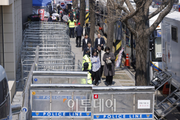 ▲헌법재판소가 윤석열 대통령 탄핵심판 선고일을 발표한 1일 서울 종로구 헌법재판소 앞에 경찰 차단벽이 세워져 있다. 헌재는 이날 기자단에 윤 대통령 탄핵 사건에 대한 선고일은 4월 4일 오전 11시 대심판정에서 있을 예정이라고 발표했다. 윤 대통령이 탄핵소추된 지 111일, 변론 종결 이후 38일 만이다. 조현호 기자 hyunho@