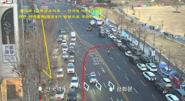 도로 통제에 서울 종로구도 이날 오전 안전재난문자를 통해 "현재 집회 시위로 인해 율곡터널~안국사거리 양방향 도로 교통 통제 중"이라며 "교통 정보를 확인하시고, 우회 도로를 이용 바란다"고 안내했다.