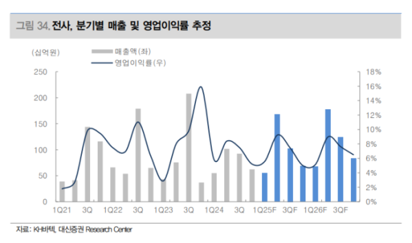 대신증권은 KH바텍의 2025년 매출 3937억 원(26.5% YoY), 영업이익 313억 원(43.3% YoY)를 전망했다. 2분기 매출은 1678억 원으로 전년 대비 205% 증가할 것으로 예상되는 등 2028년까지 연평균 18%의 매출이 증가할 것이라는 전망이다.