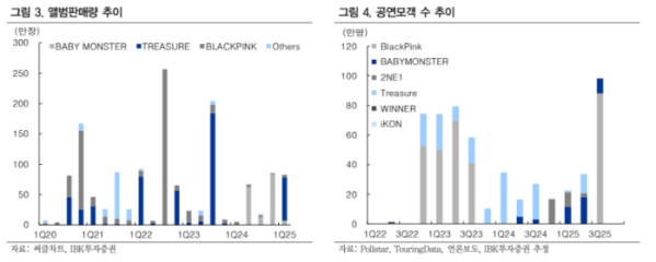 김유혁 IBK투자증권 연구원은 “블랙핑크와 베이비몬스터(베몬)의 추정 실적 상향에 기인한다”고 설명했다.