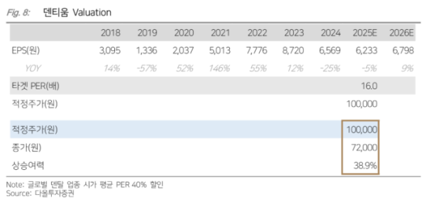 박종현 다올투자증권 연구원은 "덴티움은 2024년 주당배당금(DPS) 600원을 결정했으나, 배당성향은 7.1%에 불과했다"라며 "2023년 코스피 평균 배당 성향 30% 적용 시, 2025년 기대 DPS는 2400원(시가 배당률 3.3%)이 된다"라고 설명했다.