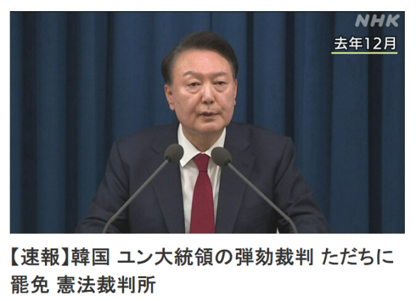 4일 일본 NHK방송은 “윤 대통령이 즉시 파면됐다. 60일 안에 대선이 열리게 됐다. 한국 대통령이 파면된 것은 2017년 박근혜 전 대통령 이후 두 번째”라고 보도했다.