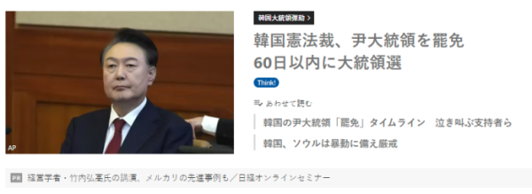탄핵이 선고되자 닛케이도 60일 이내 실시되는 대선에 집중하며 “한국 헌법재판소가 4일 윤 전 대통령을 파면하기로 결정해 윤 전 대통령이 즉시 대통령직을 내려놓게 됐다”고 보도했다.