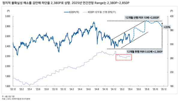 NH투자증권은 헌법재판소의 탄핵 인용으로 한국 고유의 불확실성이 해소될 것으로 전망한다며, 2025년 연간 코스피 범위 하단을 상향했다고 4일 밝혔다. NH투자증권이 전망한 2025년 연간 코스피 범위는 2350~2850포인트(p)다.