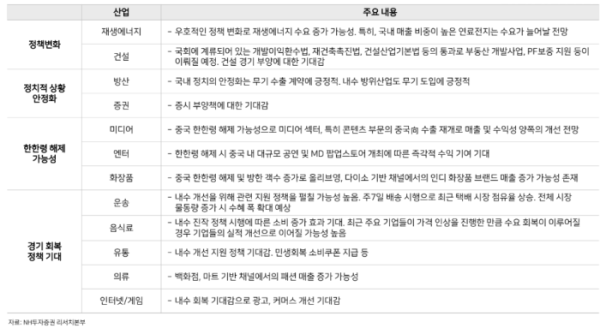 당 리서치센터는 정치적 불확실성 해소에 따른 주요 산업별 영향을 총 4분류로 나눴다. 정책변화 수혜를 볼 산업은 재생에너지와 건설이었다. 방산과 증권은 정치적 상황 안정화를, 미디어, 엔터, 화장품은 한한령 해제 가능성을 기대해볼 수 있다고 전했다. 또한, 경기 회복 정책 수혜를 볼 산업은 운송, 음식료, 유통, 의류, 인터넷/게임이라고 분석했다.
