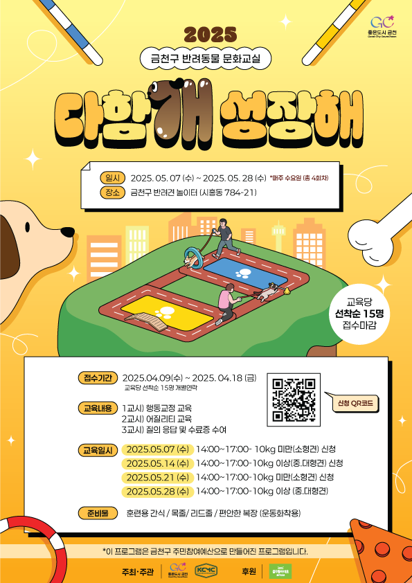 프로그램에 관심 있는 관내 반려인은 18일까지 금천구청 누리집이나 홍보물의 정보무늬(QR코드)에 접속해 신청서를 제출하면 된다. 회차별 15명(15마리)까지 선착순으로 모집한다. 단, 반려견은 동물 등록이 되어 있어야 하며 맹견은 신청할 수 없다. 자세한 사항은 금천구청 지역경제과로 문의하면 안내받을 수 있다.
