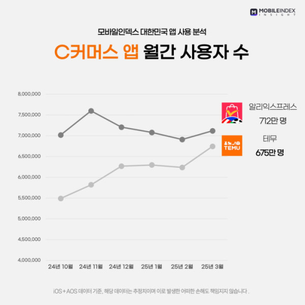 5일 데이터플랫폼 기업 아이지에이웍스의 모바일인덱스에 따르면 알리의 3월 월간활성이용자수(MAU)는 약 712만 명으로 전년 동월 대비 2.6% 증가했다. 이어 같은 기간 테무의 MAU는 약 675만 명으로 전년 동월 대비 6.1% 증가했다.