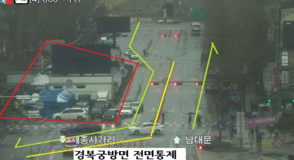 북촌로 재동초등학교에서 안국역까지 양방향, 세종대로 숭례문에서 시청역 방향, 광화문 방향 태평교차로, 동화면세점에서 대한문, 교보빌딩에서 광화문역 2번 출구 방향도 전차로 전면 통제되고 있다.