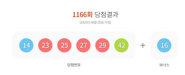 동행복권이 제1166회 당첨번호를 공개했다. 로또 1등 당첨번호는 '14, 23, 25, 27, 29, 42'다. 2등 보너스 번호는 '16'이다. 이번 1등 당첨자는 14명으로 20억7231만9938원을 받는다.