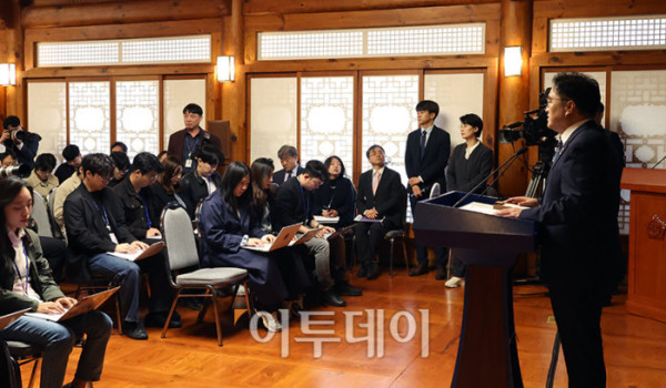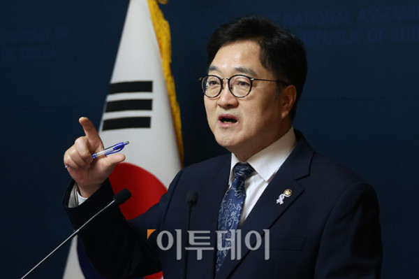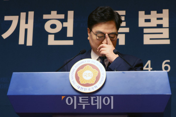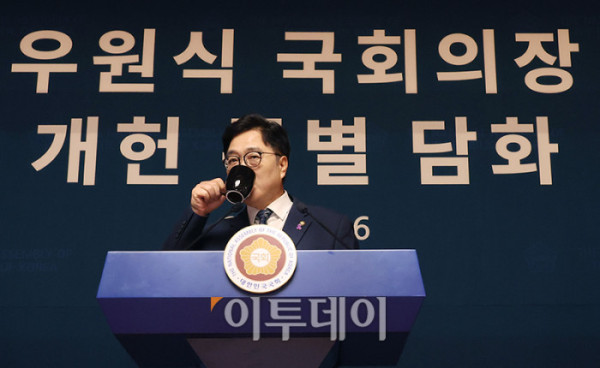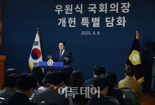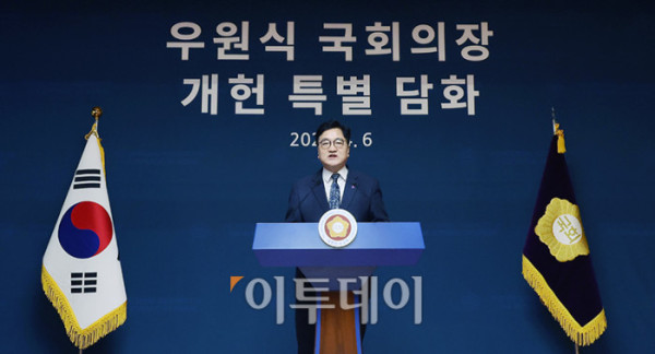 ▲우원식 국회의장이 6일 서울 여의도 국회 사랑재에서 개헌 특별 담화를 하고 있다. 이날 우 의장은 "국민주권과 국민통합을 위한 삼권분립의 기둥을 더 튼튼하게 세우기 위한 개헌이 필요하다"며 "이번 대통령 선거일에 개헌 국민투표를 동시에 시행할 것을 제안한다"고 말했다. 고이란 기자 photoeran@