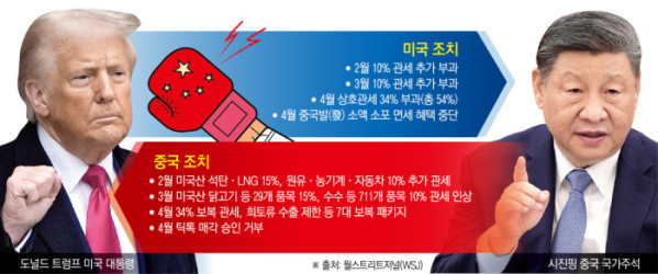 트럼프 대통령은 2일 중국에 대한 34% 추가 관세를 발표했다. 이에 트럼프 2기 중국에 새롭게 부과한 관세율은 무려 54%에 달했다. 이에 중국 정부도 전날 “10일부터 모든 미국산 수입품에 34% 관세를 부과하겠다”고 반격에 나섰다.