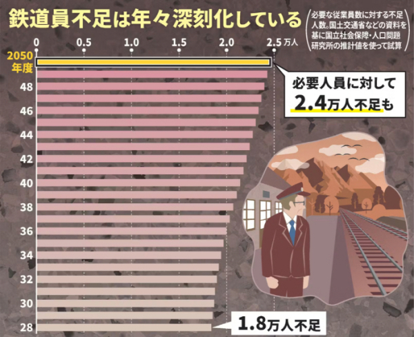 6일 니혼게이자이신문(닛케이)은 2050년까지 철도 운행에 필요한 철도원이 2만4000명 부족할 수 있으며, 이미 철도원을 충분히 확보하지 못해 운행 편이 줄거나 중단되는 지방 노선이 늘고 있다고 보도했다.