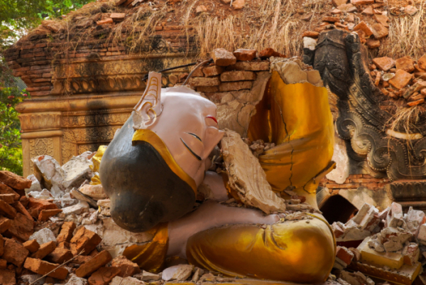 ▲미얀마 아마라푸라에 4일(현지시간) 지진으로 파손된 부처 동상이 보인다. 아마라푸라(미얀마)/로이터연합뉴스