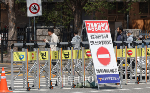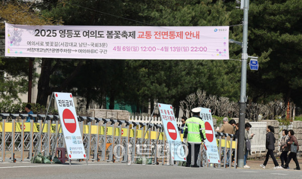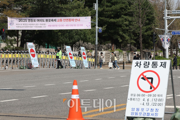 ▲여의도 봄꽃축제를 앞둔 6일 서울 영등포구 여의서로 국회 뒤편에 교통이 통제되고 있다. 8일부터 닷새간 열리는 이번 행사를 위해 영등포구청은 13일 22시까지 여의서로(서강대교 남단~국회5문~국회3문~의원회관사거리) 구간 교통통제를 실시한다.고이란 기자 photoeran@