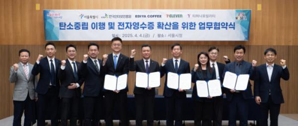 이디야커피는 4일 서울시청에서 서울시와 한국인터넷진흥원, 코리아세븐, 티머니모빌리티와 함께 ‘전자영수증 도입’을 위한 5자 업무협약(MOU)을 체결했다고 7일 밝혔다. 체결식에는 조규동 이디야커피 대표이사와 권민 서울특별시 기후환경본부장, 김정희 한국인터넷진흥원 디지털안전지원본부장, 김홍철 코리아세븐 대표이사, 조동욱 티머니모빌리티 대표이사가 참석했다.