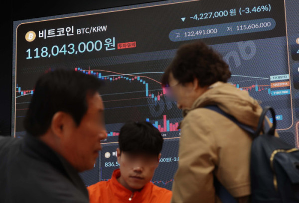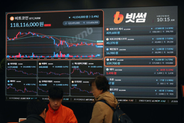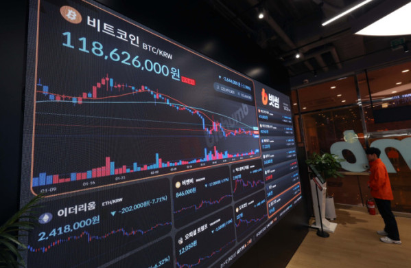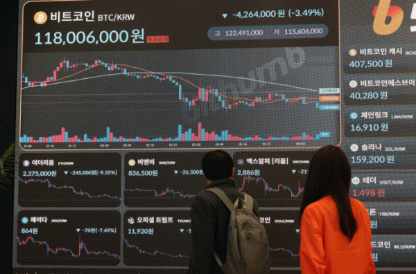 도널드 트럼프 미국 행정부의 상호관세 정책으로 비트코인 가격이 큰 폭으로 하락했다. 7일 서울 서초구 빗썸라운지에 비트코인 등 가상자산 실시간 거래가격이 표시되고 있다. 6일(미국 현지시간) CNBC, 코인텔그래프 등에 따르면 이날 한 때 비트코인 가격은 전날보다 4% 하락한 7만8835.07달러를 기록했다. 8만 달러 선에 이어 7만9000달러 선도 무너졌다. 이는 지난 1월 기록한 사상 최고치 대비 약 34% 폭락한 수준이다.