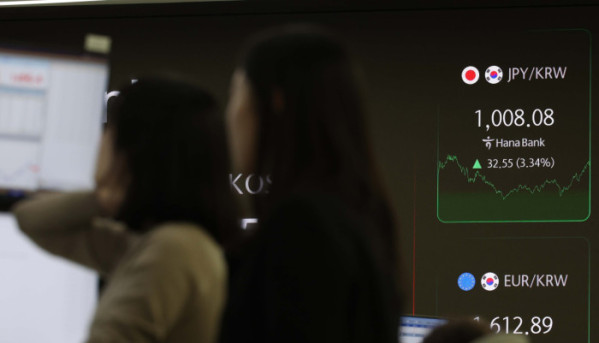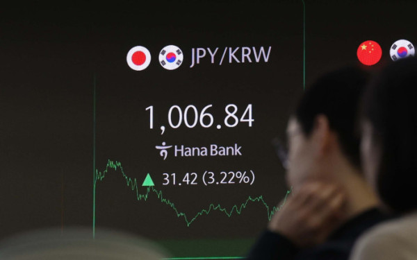 미국의 상호관세 여파로 안전자산으로 분류되는 엔화의 가치가 급등하고 있다. 원·엔 환율이 100엔당 1000원을 넘어선 7일 서울 중구 하나은행 본점 딜링룸에서 딜러들이 업무를 보고 있다.