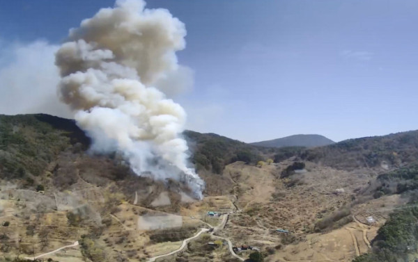 ▲7일 경남 하동군 옥종면 회신리 한 야산에서 산불이 발생해 연기가 피어오르고 있다. (사진제공=산림청)
