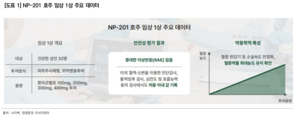한양증권에 따르면 NP-201은 섬유화 치료에 대한 잠재력 때문에 개발 초기부터 해외 기업들과 수많은 기술이전 논의가 있던 물질이다. 최근 미국 소재 제약사와 기술이전에 대한 상당히 구체적인 논의를 진행했으며, 늦어도 6월에는 본계약 체결이 이루어질 것으로 기대하고 있는 상황이라고 한다.