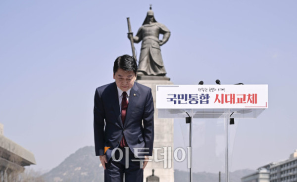 ▲안철수 국민의힘 의원이 8일 서울 종로구 광화문광장 이순신 장군 동상 앞에서 제21대 대통령 선거 출마 선언에 앞서 고개 숙여 인사를 하고 있다. 조현호 기자 hyunho@