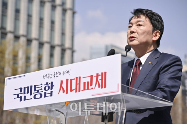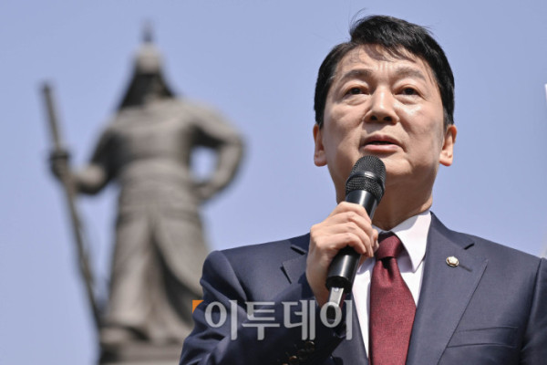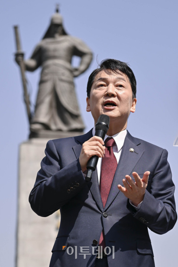 안철수 국민의힘 의원이 8일 서울 종로구 광화문광장 이순신 장군 동상 앞에서 제21대 대통령 선거 출마 선언을 하고 있다. 조현호 기자 hyunho@