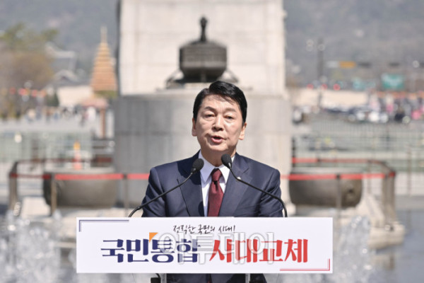 ▲안철수 국민의힘 의원이 8일 서울 종로구 광화문광장 이순신 장군 동상 앞에서 제21대 대통령 선거 출마 선언을 하고 있다. 조현호 기자 hyunho@