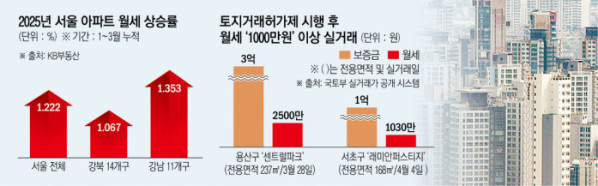 지난달 서울 토지거래허가구역(토허제) 시행 이후 아파트 임대 시장 내 월세 상승세가 뚜렷하다. 강남 3구(서초·강남·송파구)와 용산구 등 핵심지가 토허제로 묶이면서 매매는 물론 갭투자를 통한 전세 물량까지 줄면서 실수요자들이 월세로 몰리고 있다. 여기에 6월 치러질 대선을 앞두고 부동산 정책 불확실성까지 커지면서 월세 수요는 당분간 늘어날 전망이다.
