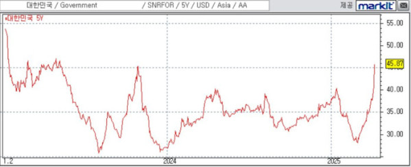 8일 투자은행(IB) 업계에 따르면 전일(현지시각) 미국 뉴욕 시장에서 5년물 한국 CDS 프리미엄은 하루 만에 8.63bp 오른 49.59bp를 기록했다. 이는 2023년 1월 6일(49.80bp) 이후 약 2년 만에 가장 높은 수준이다. 1년물 CDS프리미엄은 5.33bp 오른 33.75bp였다.