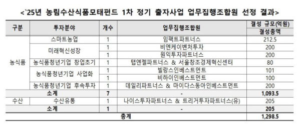 이번 출자사업을 통해 선정된 농식품펀드는 7개, 1093억5000만 원, 수산펀드 1개, 205억 원 규모다.