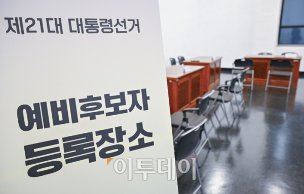 ▲제21대 대통령 선거일이 확정된 8일 경기 과천시 중앙선거관리위원회 청사에 마련된 대선 예비후보자 등록장소 모습. 정부는 이날 한덕수 국무총리 대통령 권한대행 주재로 열린 국무회의에서 윤석열 전 대통령 파면으로 치러지는 21대 대통령 선거일을 6월 3일로 확정했다. 조현호 기자 hyunho@