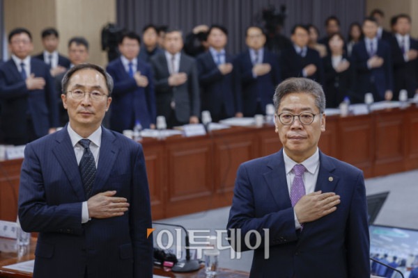 ▲중앙선거관리위원회 김필곤(왼쪽) 상임위원과 김용빈 사무총장 등 참석자들이 8일 경기 과천시 중앙선거관리위원회 청사에서 열린 21대 대통령선거 선거관리 대책회의에서 국민의례를 하고 있다. 조현호 기자 hyunho@