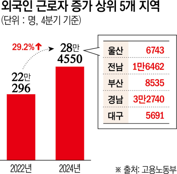 고용노동부에 따르면 같은 기간 외국인근로자는 22만296명에서 28만4550명으로 6만4254명(29.2%) 증가했다. 울산(88.6%) 지역의 증가율이 가장 높았다. 이어 전라남도(49.1%), 부산(47.5%), 경상남도(46.1%) 등 순이었다. 경기도와 인천은 각각 19.3%, 16.6% 증가했다. 반면 서울은 2.5% 감소했다.