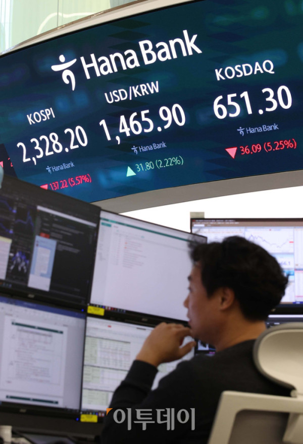 ▲코스피가 미국의 상호관세 여파로 충격에 휩싸이며 5% 넘게 폭락했다. 7일 서울 중구 하나은행 딜링룸 모니터에 코스피 종가가 표시되고 있다. 이날 코스피는 전 거래일 대비 137.22포인트(5.57%) 내린 2328.20에 거래를 마쳤다. 지수는 106.17포인트(4.31%) 내린 2359.25로 장을 시작한 뒤 4~5%대 급락세를 이어갔다. 코스닥 지수도 전장보다 36.09포인트(5.25%) 내린 651.30으로 거래를 마감했다. 시장에서는 미국발 무역 충돌 우려가 직접적인 원인으로 지목됐다. 한편 서울 외환시장에서 원·달러 환율은 전 거래일 대비 33.7원 오른 1467.80원에 장을 마쳤다. 코로나19 이후 5년여 만에 최대폭 상승이다. 신태현 기자 holjjak@ (이투데이DB)