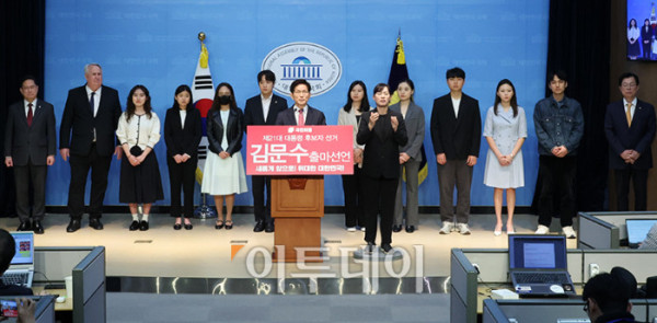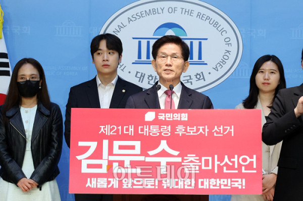 ▲김문수 전 고용노동부 장관이 9일 서울 여의도 국회 소통관에서 제21대 대통령 국민의힘 경선후보 출마 선언을 하고 있다. 고이란 기자 photoran@